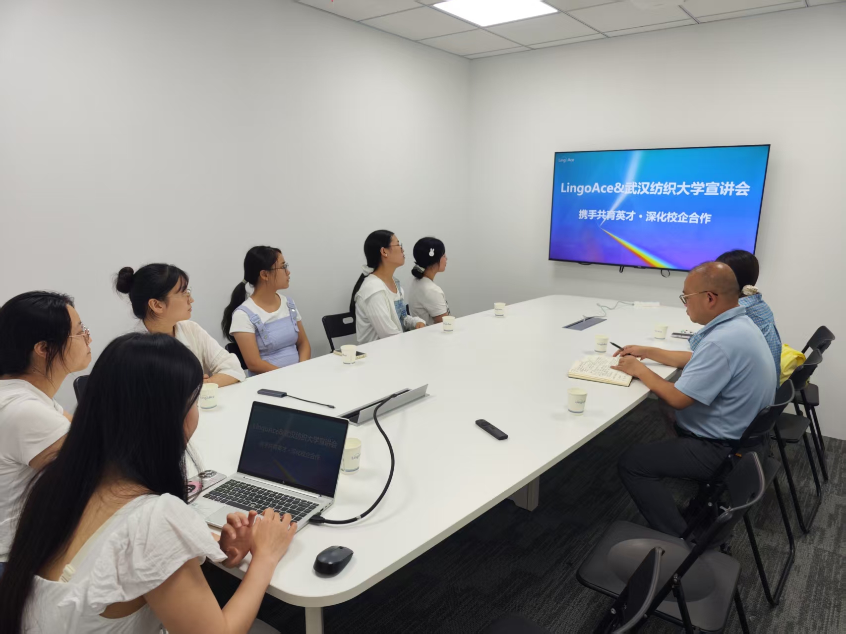 师生前往武汉领格教育科技有限公司(LingoAce)进行访企拓岗参观交流,LingoAce教师管理高级经理熊元丽、教师招聘中国区负责人何薇、教师培训师宋汉龙参与座谈研讨。