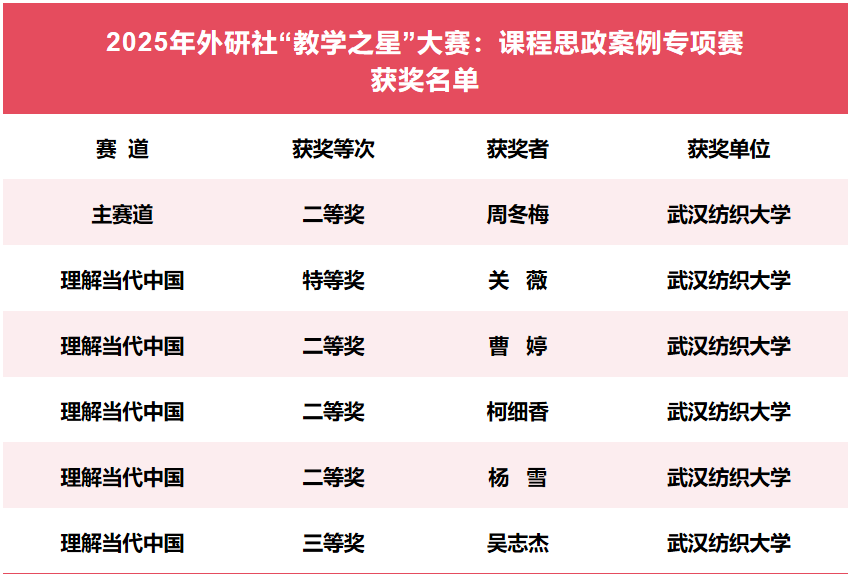 2025 年外研社“教学之星”大赛课程思政案例专项赛,以“外语教材的有效使用:讲述中国,沟通世界”为主题,面向全国本科高校英语教师开展,设主赛道与“理解当代中国” 赛道,要求参赛教师围绕教材设计思政教学方案,融入数智技术与多模态资源,助力学生提升“讲述中国、沟通世界”的能力。赛事通过专家评审,从思政育人目标、教学设计、教学反思三方面综合评分,最终评选出特等奖、一至三等奖。