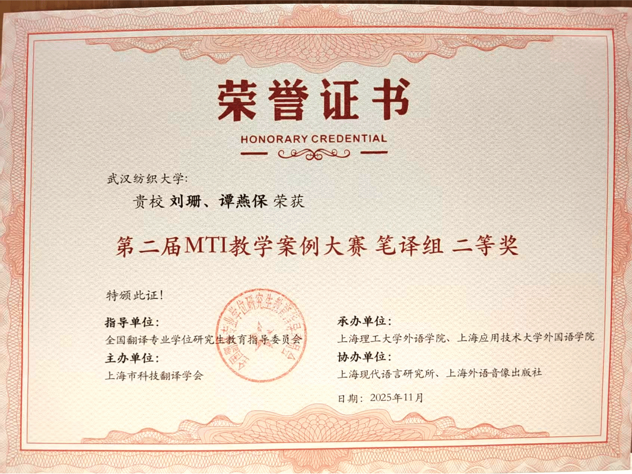 在竞赛中获得荣誉,充分体现了学院在专业学位研究生培养机制创新、翻译实践教学模式探索以及产学研协同育人等方面取得的扎实成效。学院将以此为新起点,进一步推进MTI教学改革,优化课程体系设计,全面提高翻译人才的综合素养与实务能力,致力于对接国家战略需求,助力区域产业升级与社会发展,持续推动学术研究、人才培养与社会服务三者深度融合、协同共进。