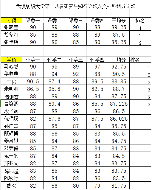 武汉纺织大学第十八届研究生知行论坛人文社科组分论坛比赛结果公示