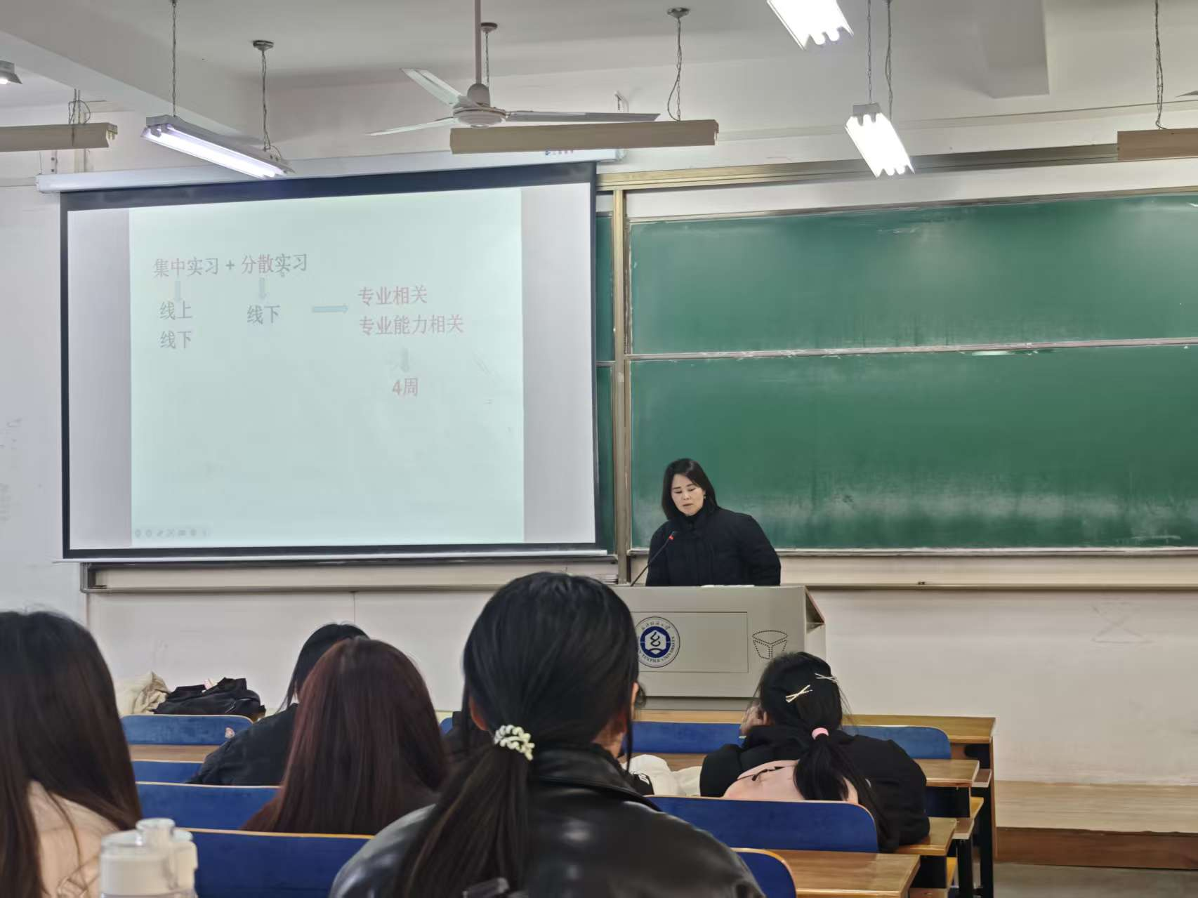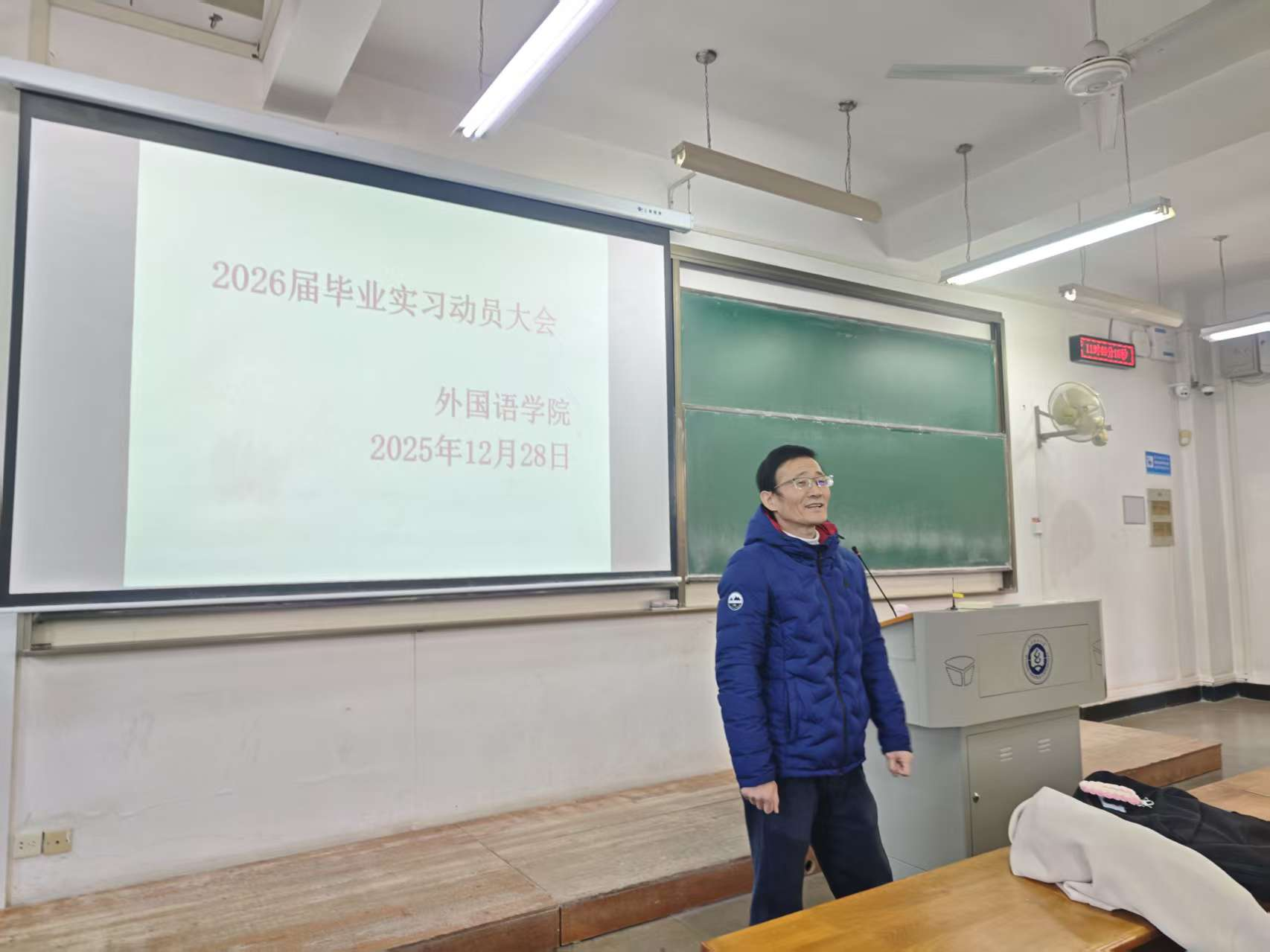 在阳光校区3号教学楼115教室举办2026届学生实习动员大会。英语专业教研室主任王越老师、商务英语专业教研室主任吴志杰老师、商务英语专业本科生导师黎健老师出席会议,为即将踏上实习岗位的学生们进行动员指导。