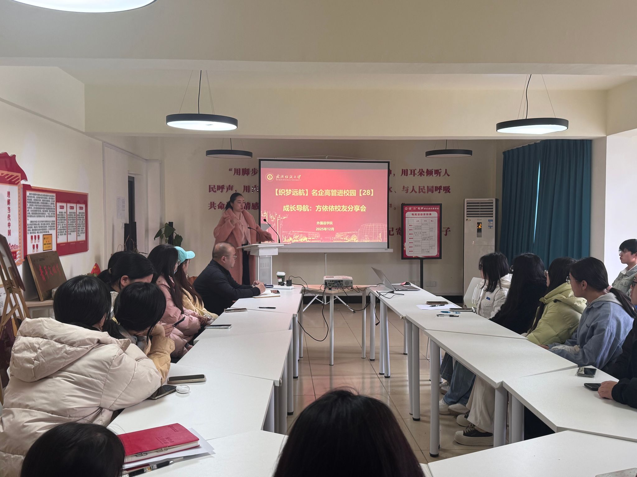 承办学校“名企高管进校园”活动,特邀湖北衣等依服饰有限公司总经理方依依女士担任主讲嘉宾,围绕“创业心路与中国传统服饰出海”为主题,学院党委副书记彭阳慈航与学院本科生、研究生一同聆听讲座,开展交流。