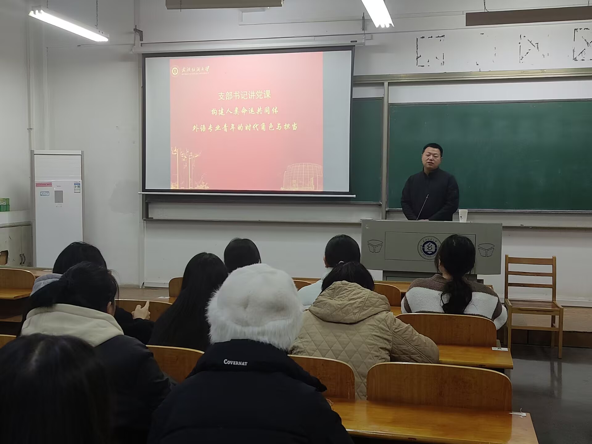 商务英语学生党支部召开专题党课学习。支部书记聂啸天以“构建人类命运共同体 外语专业青年的时代角色与担当”为主题,为支部全体党员授课。